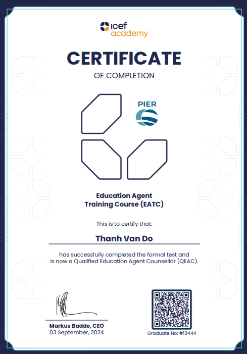 1. Cô Đỗ Thanh Vân – Đã hoàn thành khóa đào tạo Education Agent Training Course (EATC) và được chứng nhận là Qualified Education Agent Counsellor (QEAC). Đây là chứng chỉ quốc tế uy tín, đảm bảo chuyên môn cao trong lĩnh vực tư vấn du học.