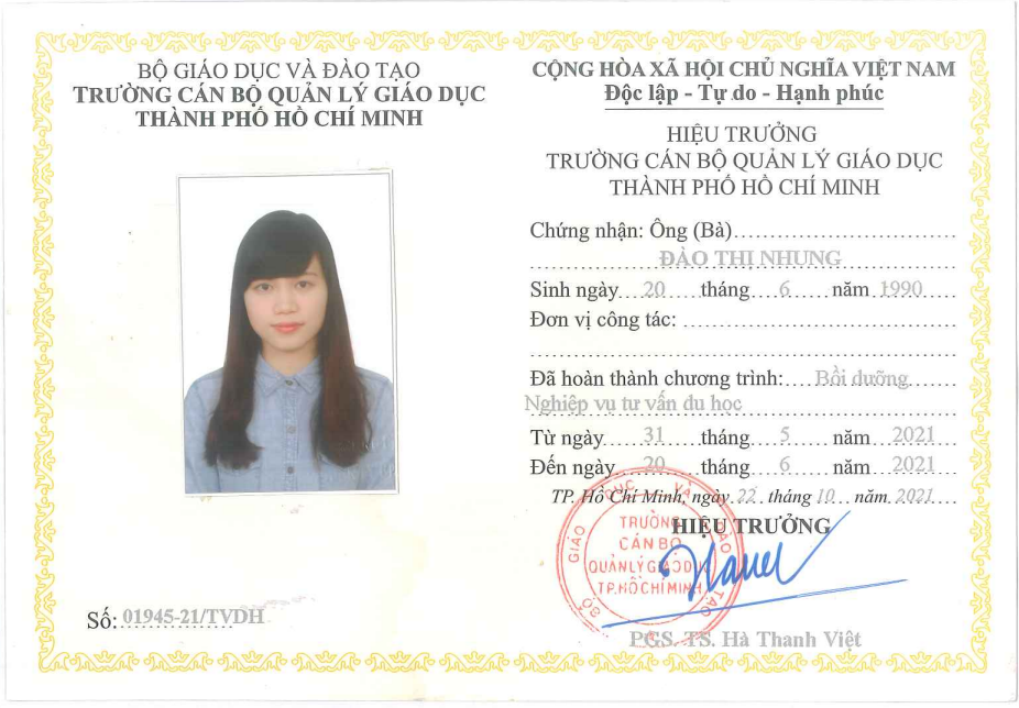 2. Cô Đào Thị Nhung – Được Trường Cán bộ Quản lý Giáo dục TP. Hồ Chí Minh cấp chứng chỉ bồi dưỡng Nghiệp vụ Tư vấn Du học, thể hiện sự am hiểu về quy định, chính sách và nghiệp vụ hỗ trợ học sinh Việt Nam trong hành trình du học.