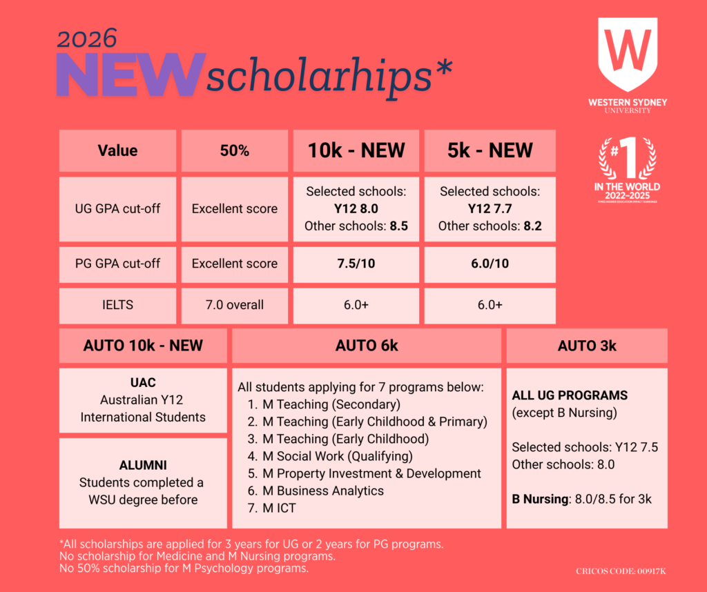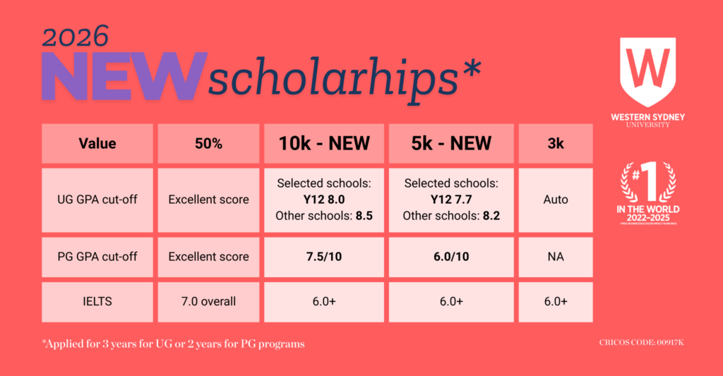 Với những suất học bổng cực ưu đãi chưa từng có, thể hiện sự quan tâm của Western Sydney University đối với sinh viên Việt Nam thì đây chính là cơ hội cực kì tốt để bạn du học Úc 2026 với mức học phí “chưa từng có”.